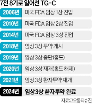 업계에서는 TG-C의 임상 3상 투약 완료를 두고 ‘7전 8기’라는 평가가 나온다. 2014년 임상 3상을 시작해 투약 완료까지 꼬박 11년이 걸렸다. 우여곡절도 겪었다. 2006년 미국에서 처음 임상 1상을 시작해 2010년 임상 2상, 2014년 임상 3상에 진입할 때까지는 비교적 순탄했다. 2017년 한국 식품의약품안전처의 신약 허가를 받으며 세계 최초 골관절염 세포유전자치료제라는 타이틀까지 얻었다. 식약처의 문턱을 넘는 데는 국내에서 진행한 임상 3상 결과가 근거가 됐다. TG-C를 투약한 환자는 무릎의 기능이 개선되고 통증이 줄어드는 게 입증됐다. 코오롱티슈진은 같은 해 코스닥시장에도 입성했다.