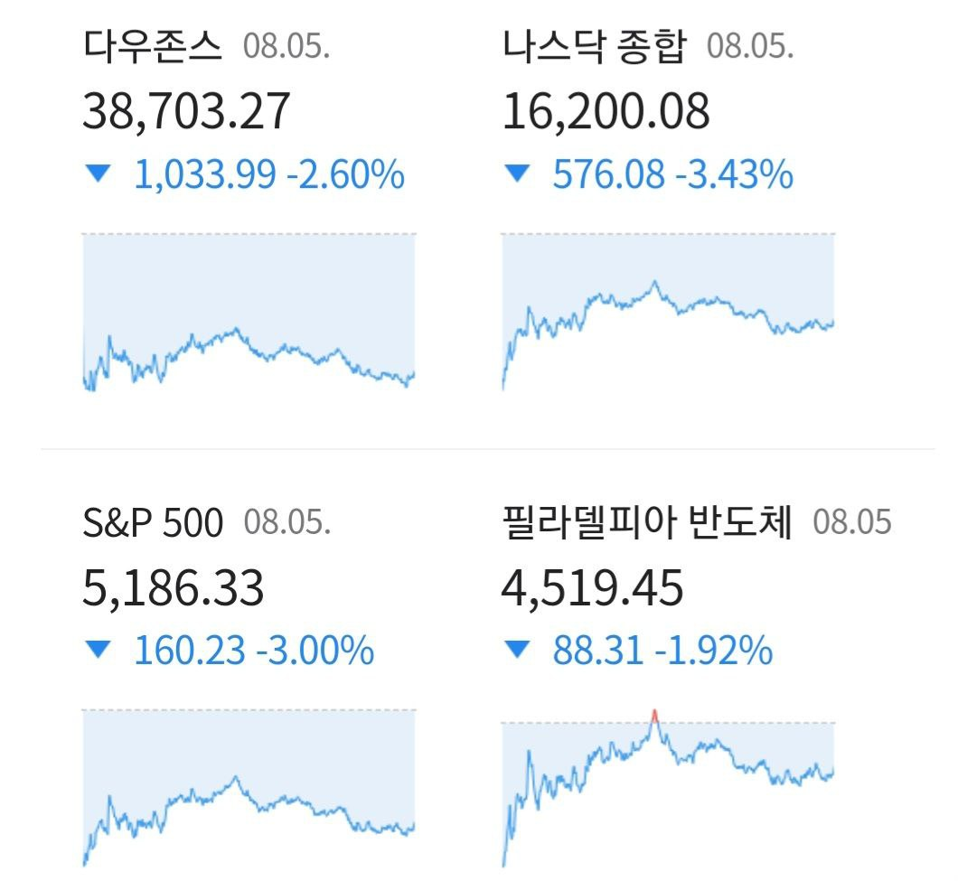 8월 5일(월) 저녁에 있었던 미국증시에 대해 간단히 정리하여 브리핑 진행하겠습니다.