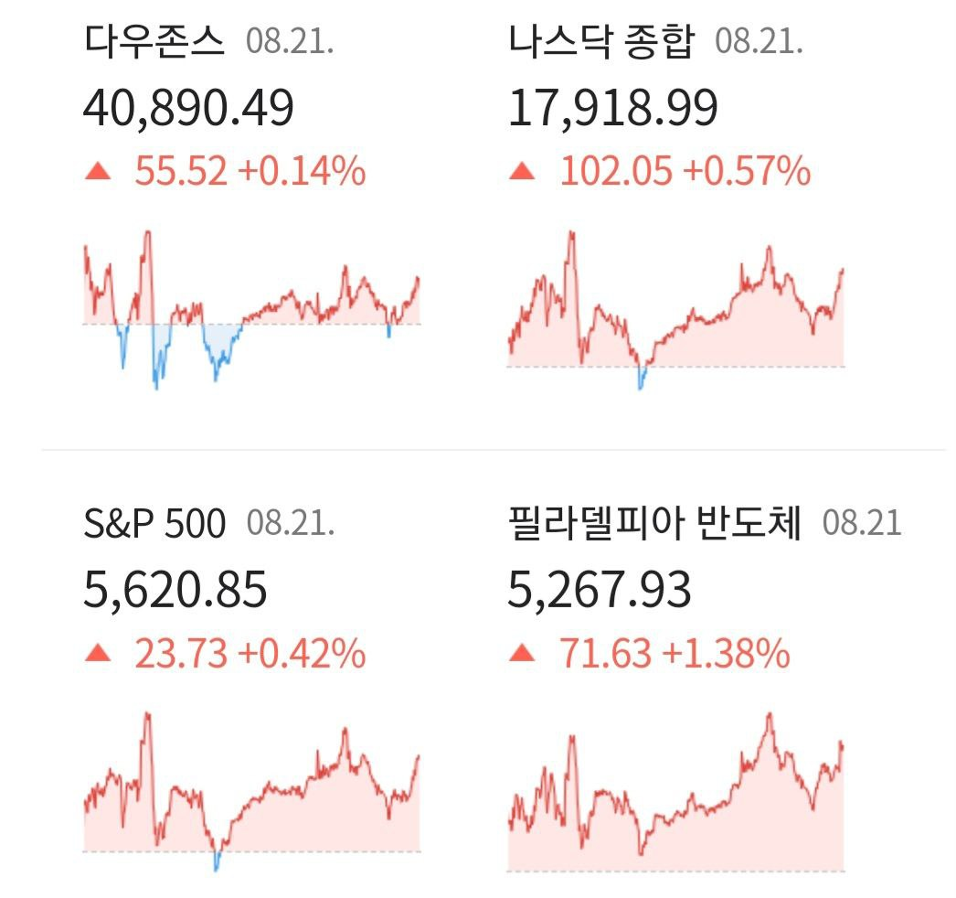 8월 21일(수) 저녁에 있었던 미국증시에 대해 간단히 정리하여 브리핑 진행하겠습니다.