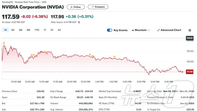29일(현지시간) 뉴욕증시에서 엔비디아는 전거래일보다 6.38% 급락한 117.59달러를 기록했다.