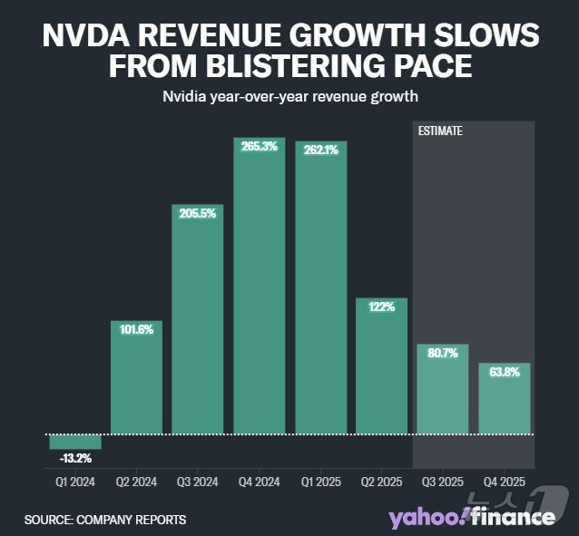 지난해 연초 월가에서 인공지능(AI) 열풍이 불기 시작하자 수백%씩 급증했던 매출이 지난 분기에 100%대로 내려왔고, 이번 분기부터는 100% 미만 성장할 것으로 예상되는 것이다.