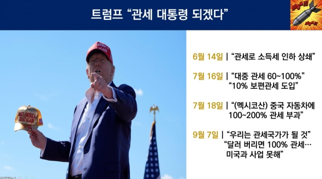 오늘은 관세 대통령이 되겠다고 선언한 도널드 트럼프 전 대통령의 관세정책을 한 번 파보려고 합니다. 지난 7일 트럼프 전 대통령은 위스콘신주 유세에서 "우리는 관세국가가 될 것"이라고 선언했습니다. 그리고 달러화 기축통화 자리를 지키겠다면서 이를 버리는 나라에는 100% 관세를 부과하는 식으로 보복적인 관세를 매겨서 미국과 사업을 못하게 만들겠다고 큰소리를 쳤는데요.