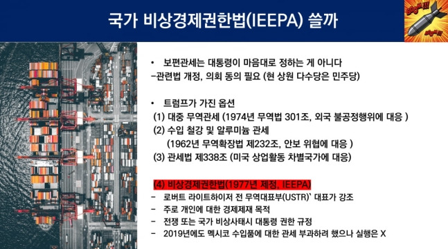 이 비상경제권한법은 전쟁과 같은 진짜 국가 비상사태에서 대통령한테 권한을 주는 겁니다. 원래는 이게 이런 국가 간 통상정책에 쓰는 게 아니고요. 적국 스파이나 적국 기업 같은 개인에 대한 경제 제재를 목적으로 하는 겁니다. 사실은 라이트하이저 대표의 마음 속에는 이 제도가 지난 1기 때도 있었습니다. 하지만 실행은 못했는데요. 최근 워싱턴 통상 전문가 인터뷰를 했는데, 공화당 캠프 내에서 이 제도를 실제로 진지하게 검토하고 있다고 합니다. 1기 때 준비가 안 돼서 하고 싶은 대로 못 했다, 이번엔 그럴 수 없다는 거죠.