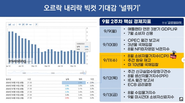 이번 주 이외에 주요 일정은 11일 소비자 물가지수 발표입니다. 지난 8월 발표된 수치는 2.9%였습니다. 시장은 지금은 더 떨어진 2.6% 정도를 기대하고 있습니다. 시카고상품거래소(CME)의 페드워치에 반영되는 금리인하 기대는 빅컷(50bp 인하) 확률에 대해서 갈피를 잡지 못하고 있습니다. 현재로서는 베이비컷이 70%, 빅컷이 30%입니다. 빅컷 확률은 한때 60%까지도 높아졌으나 이후 25%까지 내려갔다가 30% 수준에서 유지되고 있습니다. 빅컷에 대한 시장의 자신감은 크지 않다고 볼 수 있습니다. 앞서 크리스토퍼 월러 Fed 이사가 빅컷을 위해서는 데이터가 더 많이 필요하다는 취지의 발언을 한 것이 빅컷 기대감을 크게 끌어내렸습니다. 하지만 파월 의장이 아직 빅컷에 대해 열려 있는 만큼, 막판까지 데이터 추이를 봐야 할 것 같습니다. 빅컷으로 피벗을 시작하는 것은 사실 좀 부담스럽죠. 베이비컷으로 시작해서 다음 FOMC에서는 빅컷을 시도해 보는 방식이 보다 Fed에게 무난할 것으로 예상됩니다.