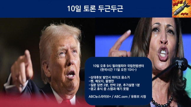 이번 주 가장 주목되는 일정은 10일 해리스 대 트럼프 토론입니다. 동부시간으로 10일 오후 9시이므로 한국시간으로 11일 오전 10시부터 진행됩니다. 규칙은 지난 번 바이든 때와 거의 동일합니다. 마이크 음소거를 놓고 신경전을 벌이던 양쪽은 지난 번처럼 상대 후보 발언시 마이크 음소거를 하는 것으로 합의를 봤습니다. 청중은 없고 펜, 메모지, 물병만으로 90분 토론을 자기 힘으로 해내야 합니다.