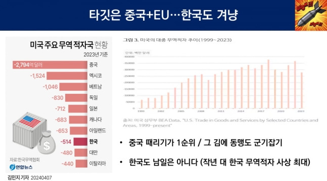 특히 7일 트럼프가 동맹에게 관세부과를 강조한 부분은 신경이 쓰입니다. 한국도 트럼프가 말하는 동맹이면서 / 미국이 비용을 많이 부담하고 있고(국방비, 한국도 물론 부담하고 있습니다) / 대미 무역흑자 규모가 큰 나라이기 때문입니다. 작년 기준으로 한국의 대미 무역 흑자규모는 514억달러 수준이었는데요. 이는 중국 멕시코 베트남 독일 일본 캐나다 아일랜드에 이어 8위입니다.
