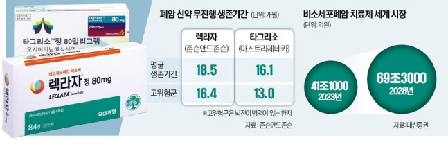표준치료법으로 활용되는 아스트라제네카의 타그리소와 렉라자를 비교한 결과를 공개했다. 타그리소는 지난해 7조7700억원의 매출을 올린 글로벌 블록버스터 항암제다. 22개월간의 환자 데이터를 추적한 결과, 렉라자는 무진행 생존기간(PFS)이 18.5개월로 타그리소(16.1개월)보다 길었다. 무진행 생존기간은 환자가 암의 진행 없이 생존하는 기간을 말한다.