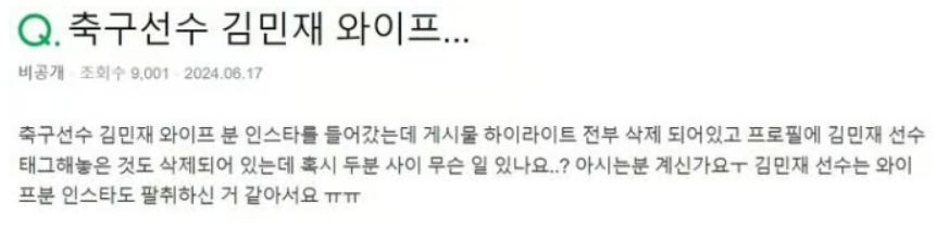 한국 축구 국가대표 김민재의 이혼 사실이 알려지면서 수개월 전 작성된 두 사람 사이의 관계에 관해 묻는 커뮤니티 글이 재조명되고 있다.