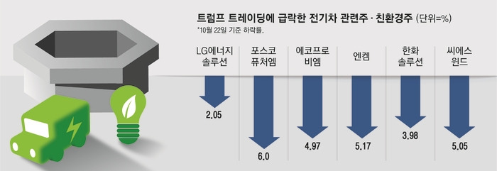 특히 9월 이후 해리스 부통령의 지지율에 잠시 반등했던 전기차 관련주와 친환경주가 22일 큰 폭으로 하락했다.