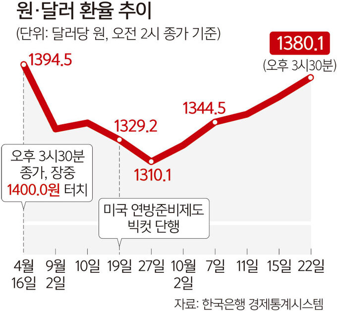 22일 서울 외환시장에서 원·달러 환율은 1379.1원으로 개장한 뒤 곧바로 1380원을 터치했다. 장중 1380원선에서 등락을 거듭하다가 전일보다 4.9원 상승한 1380.1원에 주간 거래를 마쳤다. 주간 거래 종가 기준으로 7월30일(1385.3원) 이후 최고치다.
