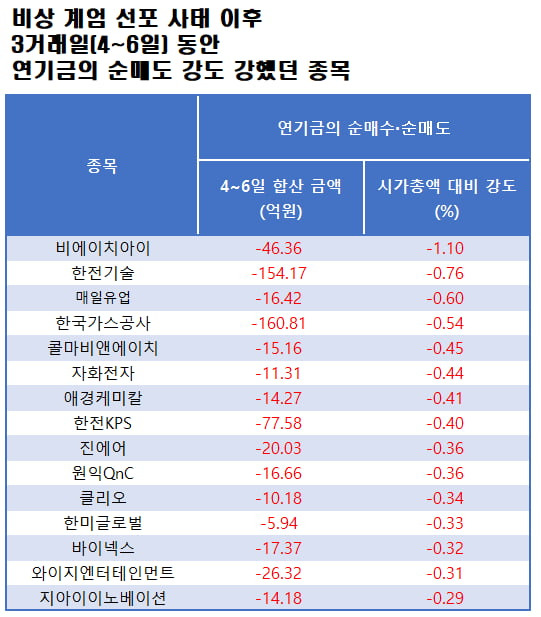 기관만 계엄 사태 이후 3거래일 내내 유가증권시장의 주식을 순매수했다. 특히 연기금이 지난 4일 1119억원, 5일 1574억원, 6일 3445억원의 자금을 쏟아부으며 코스피 하락을 막았다.