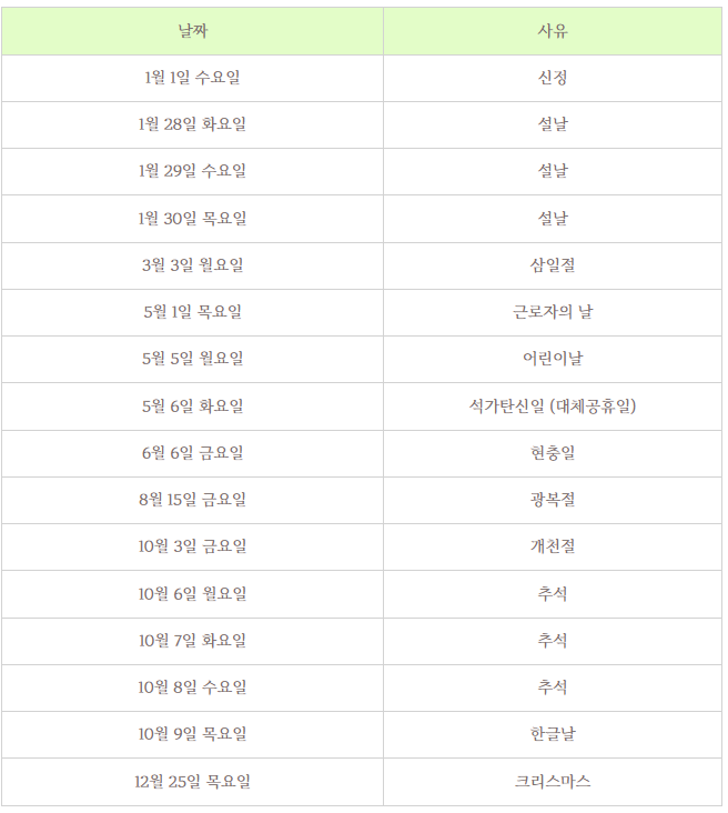 1월에는 신정, 1월 1일 수요일과 설날, 1월27일(임시공휴일=휴장),1월 28일 화요일·1월 29일 수요일·1월 30일 목요일이 휴장일입니다.