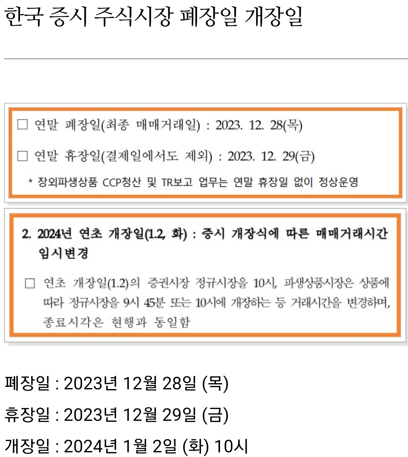 | [긴급]국내·미국 증시 23년 폐장일, 24년 개장일!! (1) | 2023.12.24 |