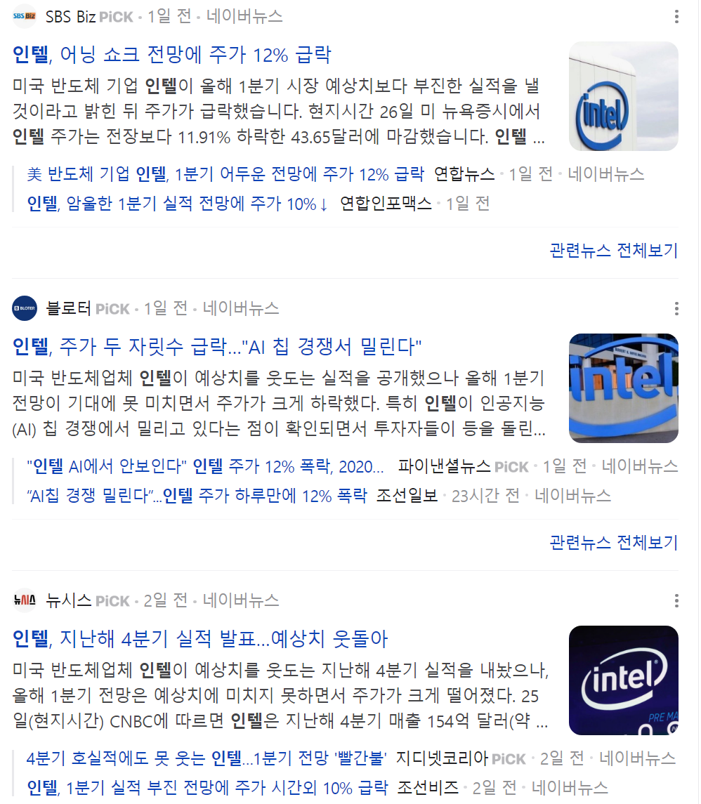 1. 인텔 4분기 가이던스 하락에 시간 외 급락