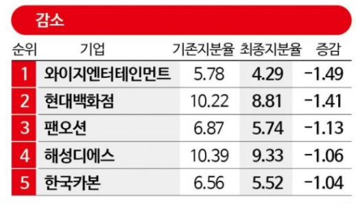 국민연금이 가장 많이 지분을 줄인 종목은 와이지엔터테인먼트(YG)였다. 기존 5.78%에서 4.29%로 1.49%포인트 감소했다. YG는 최근 '피크아웃(정점을 찍고 하락 기미를 보이는 것)'이 우려되고 있는 엔터 업황, 핵심 매출원인 블랙핑크의 개인 전속계약 불발 등 악재가 겹쳤다. 현대백화점(10.22%→8.81%), 팬오션(6.87%→5.74%), 해성디에스(10.39%→9.33%), 한국카본(6.56%→5.52%) 등도 보유 지분을 1%포인트 이상 줄였다. 지분율 감소 '톱5'의 업종은 엔터, 유통, 운수, 반도체, 자본재로 모두 달랐다. 특정 업종에 치우치지 않고 국내 증시 전반에 매도를 이어갔던 게 특징으로 꼽힌다.
