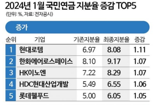 7일 금융감독원 전자공시시스템에 따르면 1월1일부터 31일까지 국민연금은 5% 이상 지분을 보유한 종목 가운데 총 28개를 거래했다. 9개는 순매수, 19개는 순매도다. 지분율 기준 가장 많이 증가한 종목은 현대로템이다. 기존 6.97%에서 8.08%로 1.11%포인트 늘었다. 한화에어로스페이스(8.10%→9.17%), HK이노엔(7.22%→8.29%), HDC현대산업개발(5.49%→6.55%), 롯데웰푸드(5.00%→6.05%)도 지분율 증가 폭이 1%가 넘었다. 현대제철(0.57% 증가)과 CJ대한통운(0.53% 증가), SK디스커버리(0.24% 증가), 티이엠씨(0.19%)도 국민연금이 지분을 늘린 종목이다.